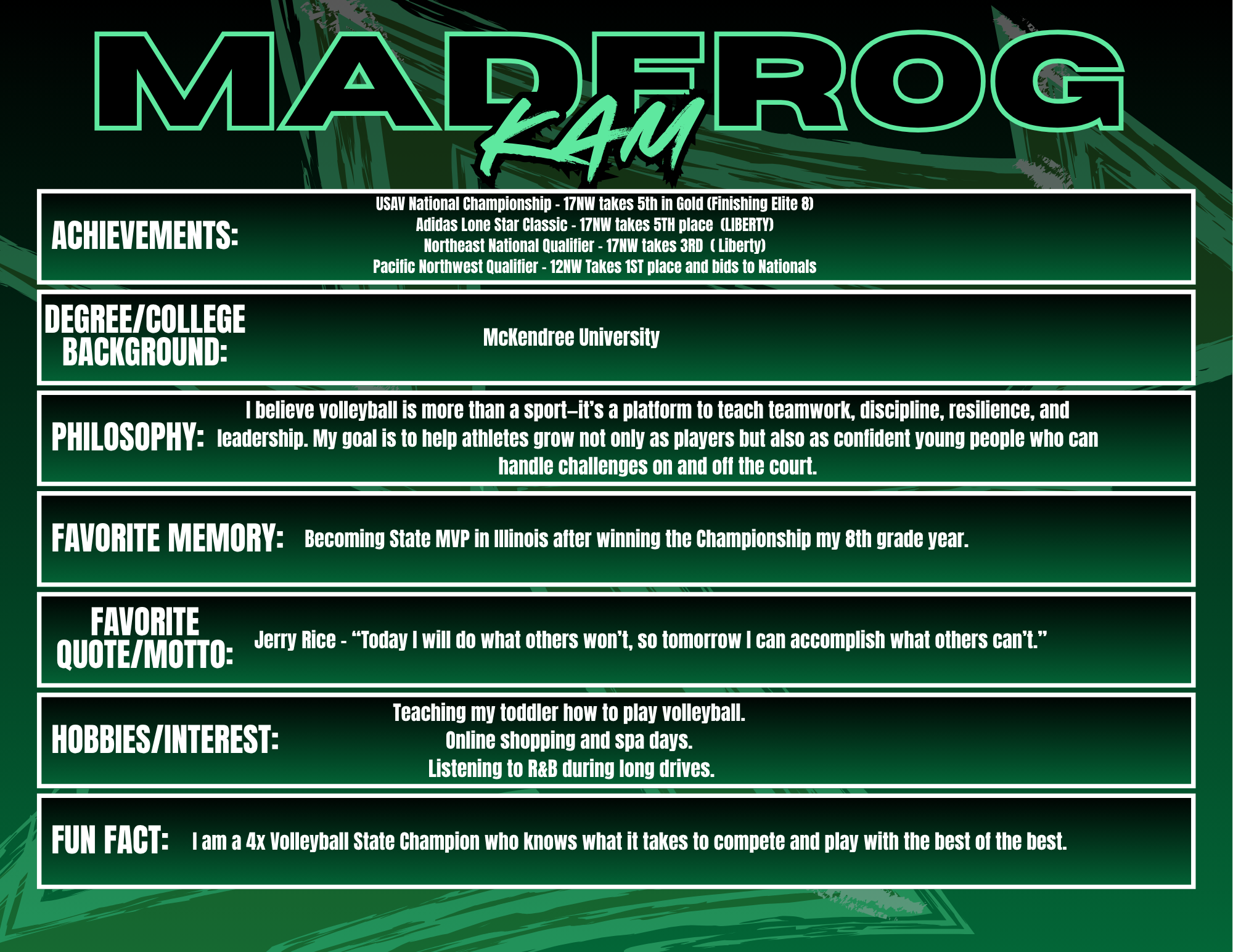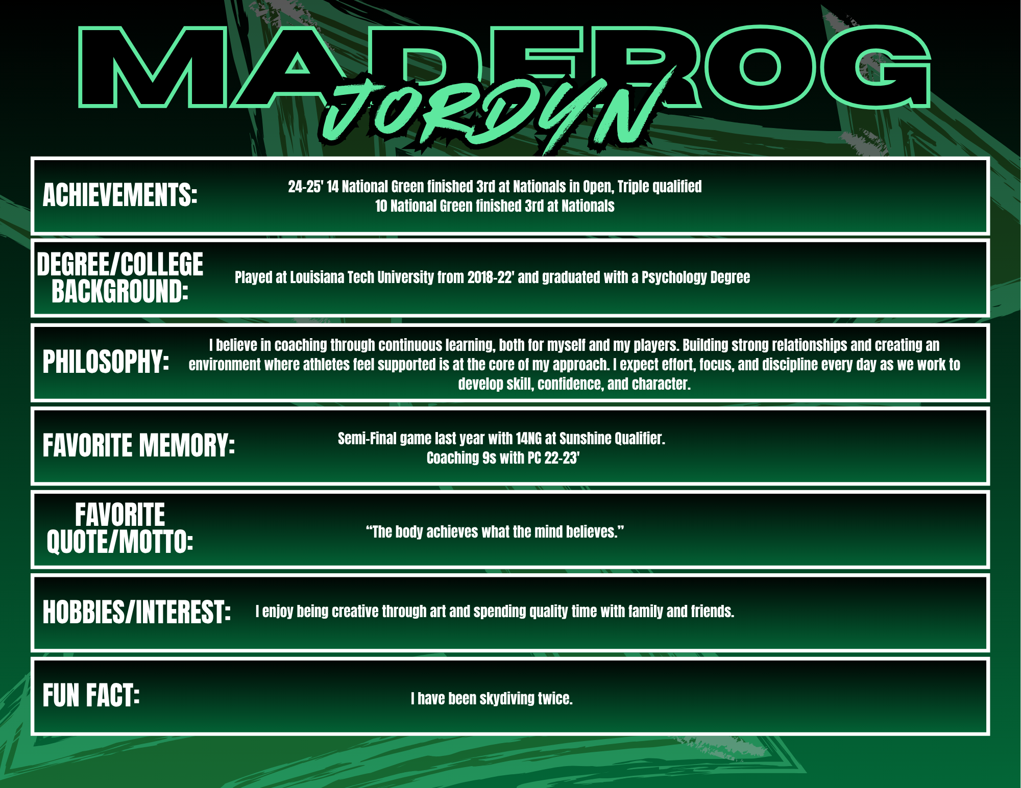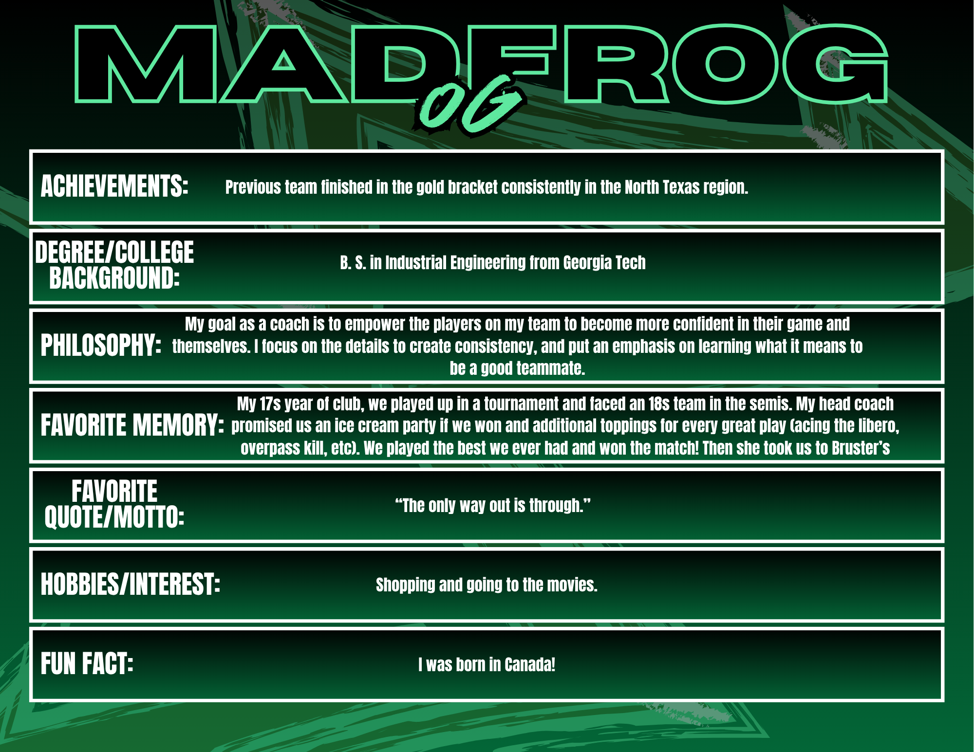 Coaching at Madfrog Volleyball Club is something I truly value because it gives me the opportunity to work with athletes who are driven, talented, and passionate about the game. The competitive environment pushes both players and coaches to bring their best every day, and I love being part of a culture that challenges athletes to grow not just as volleyball players, but as leaders and teammates. Madfrog is special because of the community around it—families, coaches, and players who are invested in each other’s success. I enjoy seeing athletes improve week after week, whether that’s in their skills, their confidence, or their understanding of the game. Watching that growth and knowing I had a part in it is what makes coaching here so rewarding.