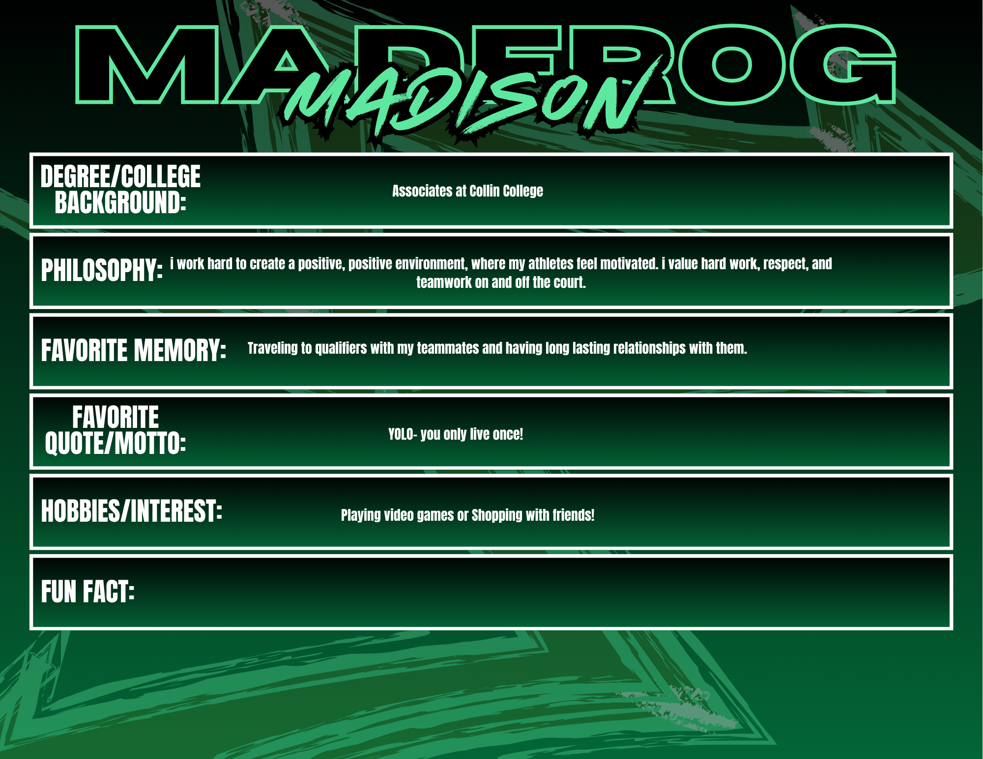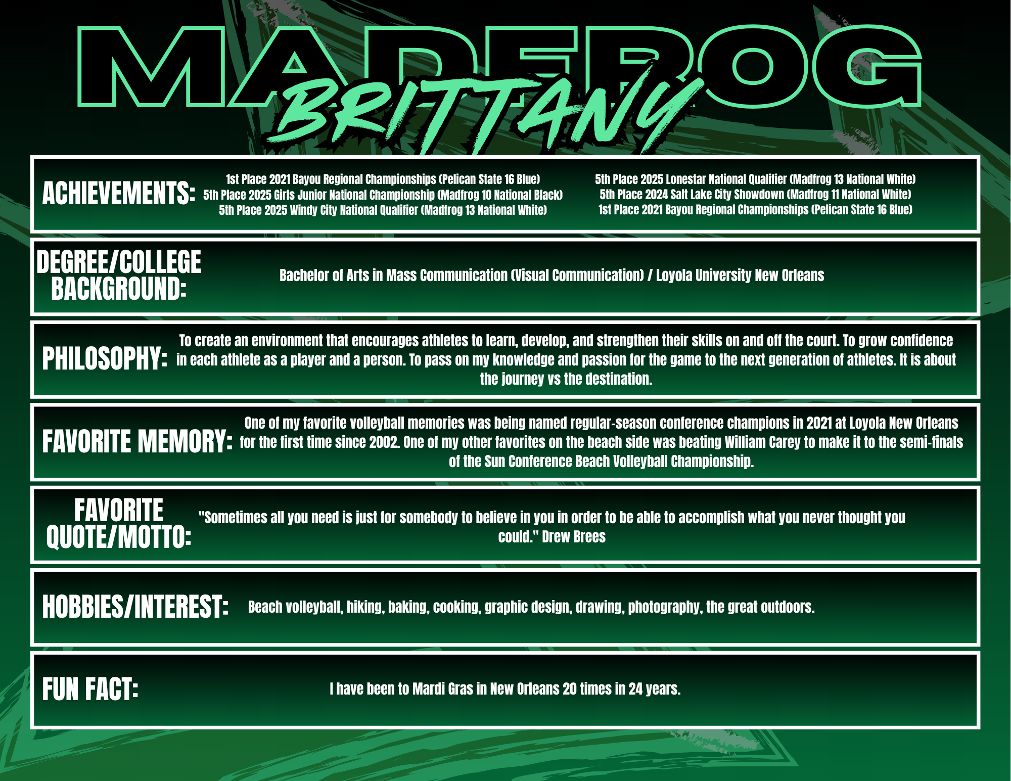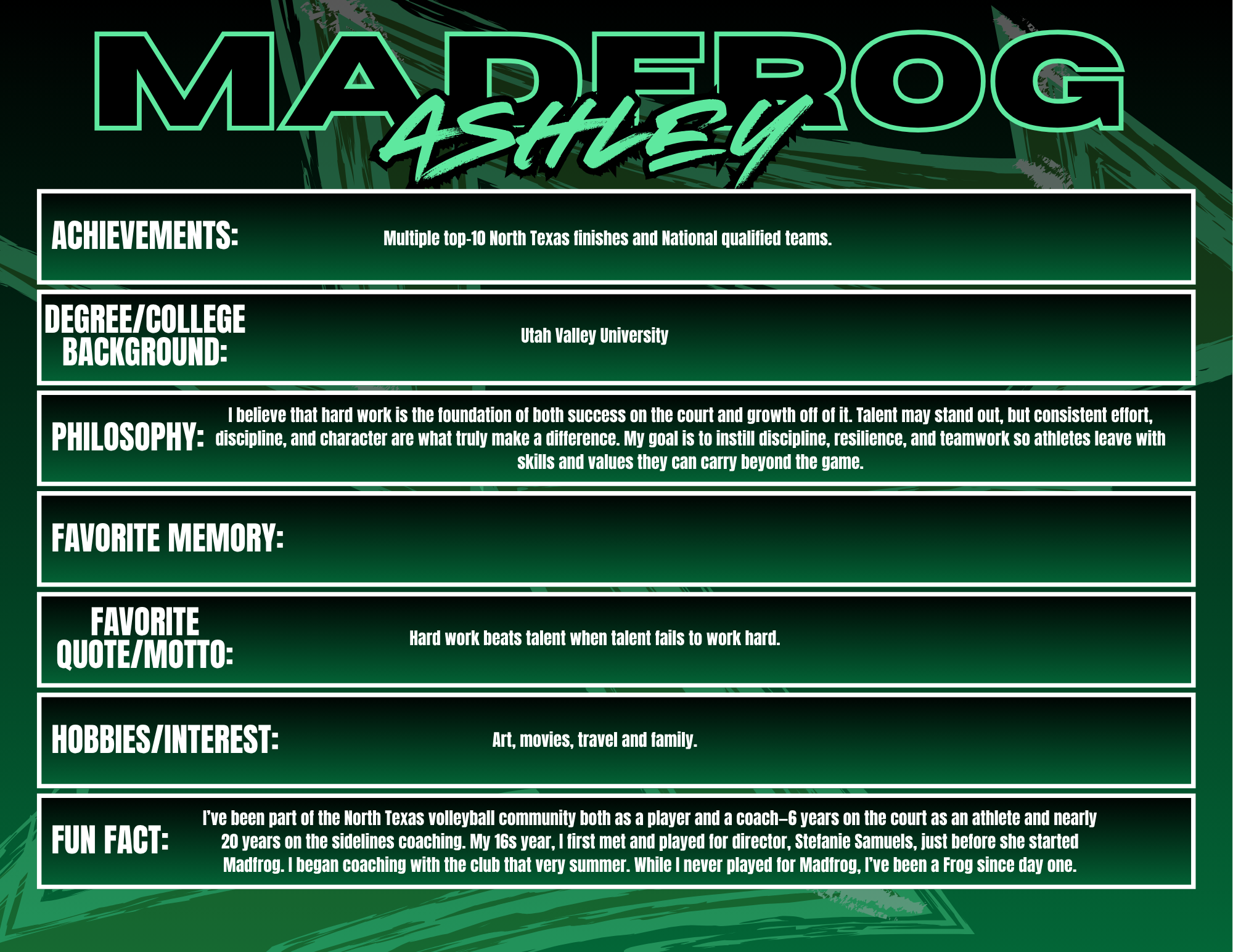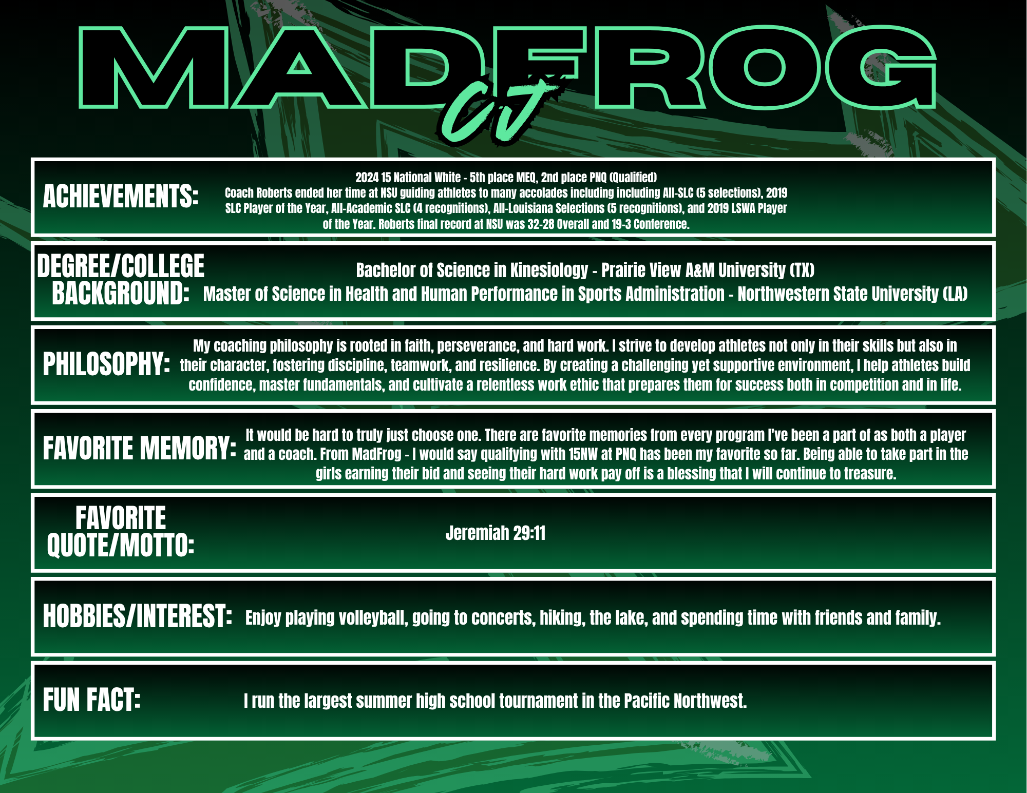 Coaching at Madfrog Volleyball Club is something I truly value because it gives me the opportunity to work with athletes who are driven, talented, and passionate about the game. The competitive environment pushes both players and coaches to bring their best every day, and I love being part of a culture that challenges athletes to grow not just as volleyball players, but as leaders and teammates. Madfrog is special because of the community around it—families, coaches, and players who are invested in each other’s success. I enjoy seeing athletes improve week after week, whether that’s in their skills, their confidence, or their understanding of the game. Watching that growth and knowing I had a part in it is what makes coaching here so rewarding.