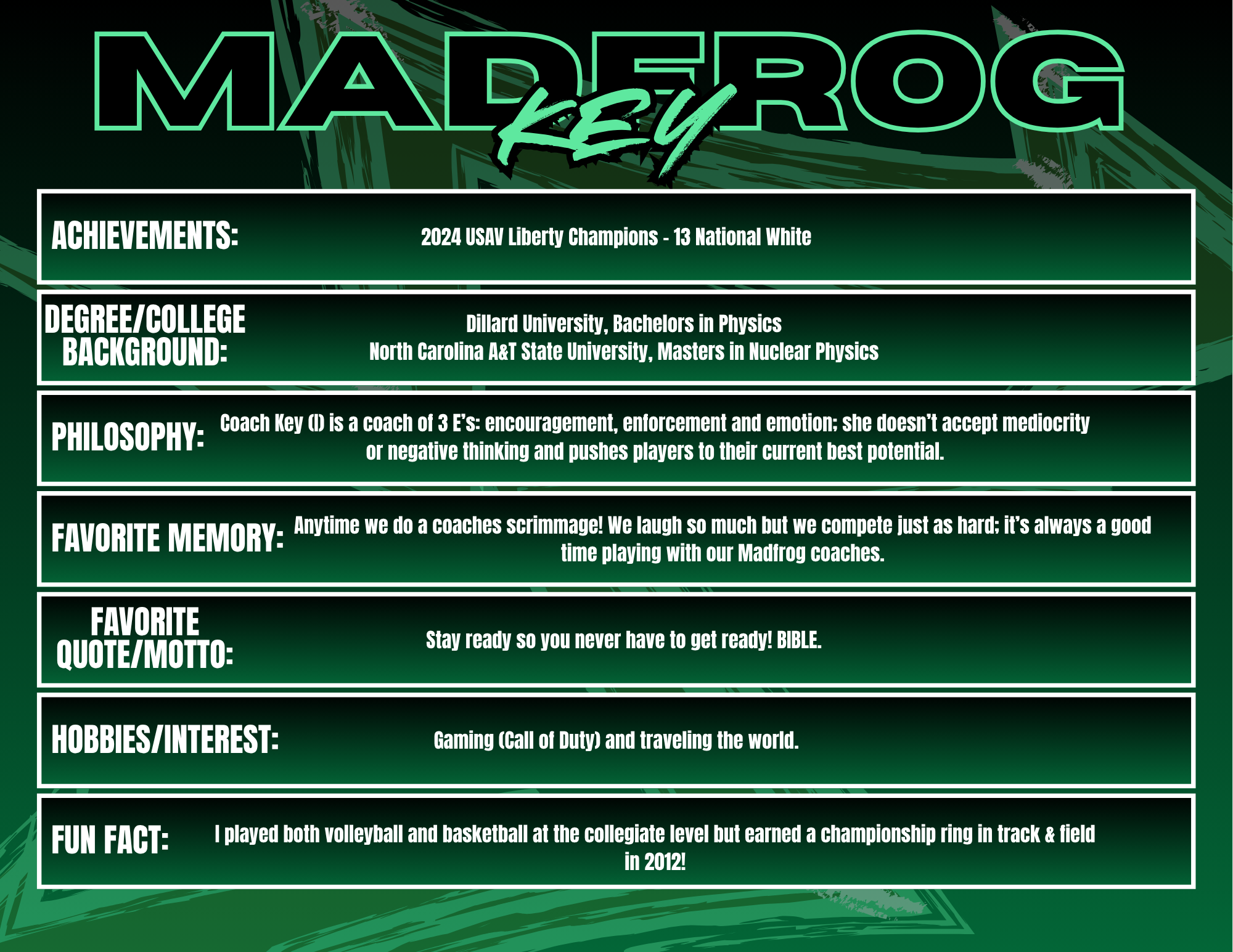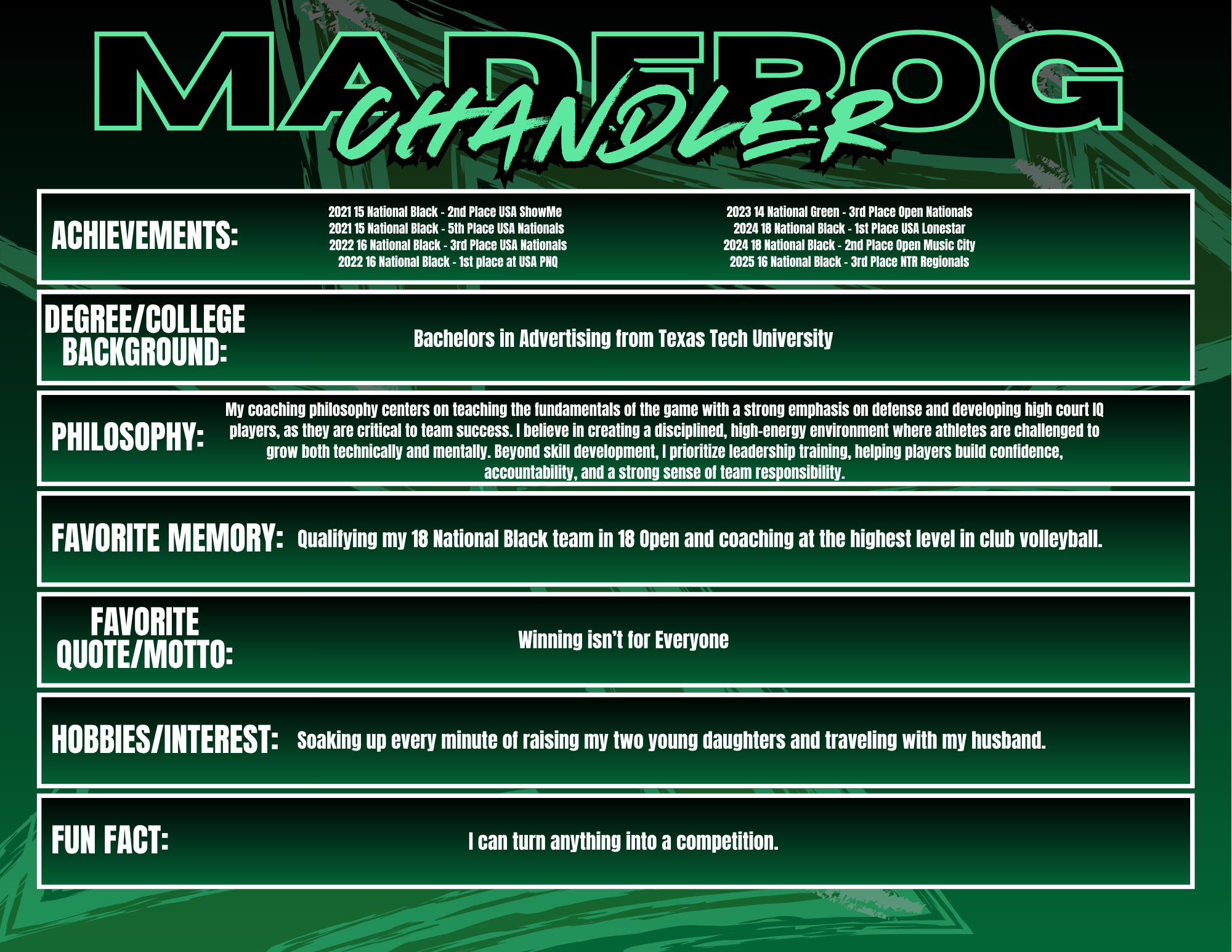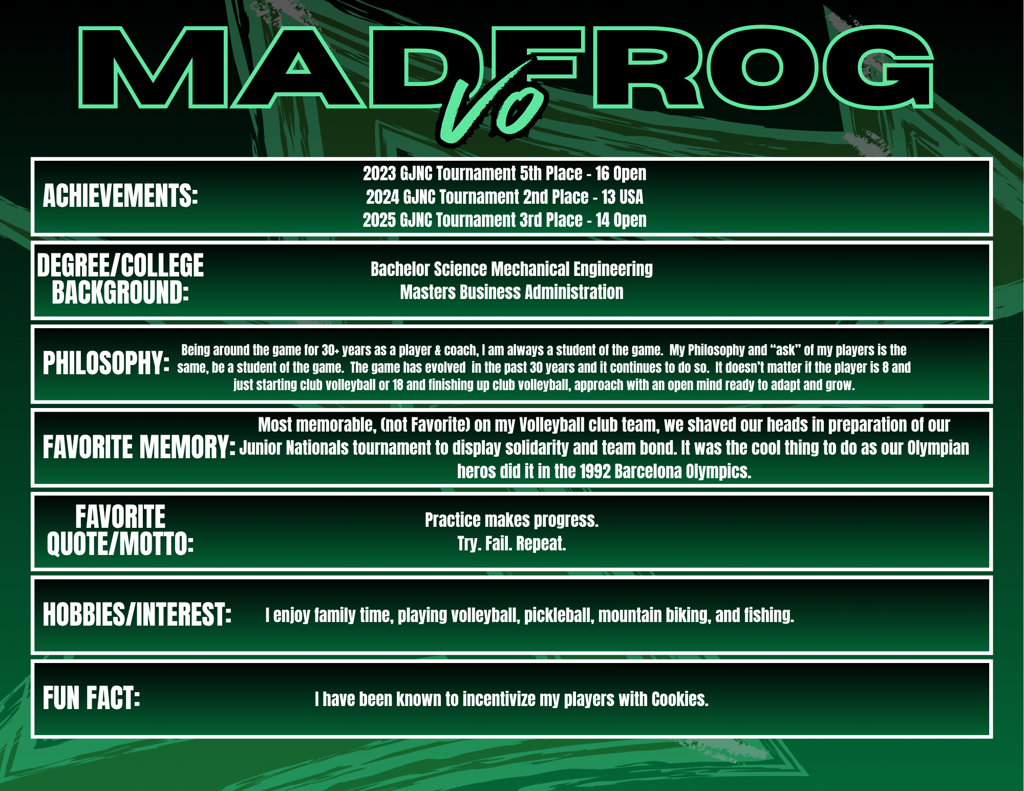Coaching at MadFrog is such an honor because it’s also where I first learned the foundations of volleyball as a player. The club’s reputation for excellence, competitiveness, and player development shaped me into the athlete I became, and now I get to give that same experience back to the next generation. MadFrog’s culture challenges athletes to push themselves while fostering teamwork, discipline, and passion - values that continue to guide my own coaching philosophy. It’s rewarding to be part of a program that not only produces top talent but also builds well-rounded individuals on and off the court.