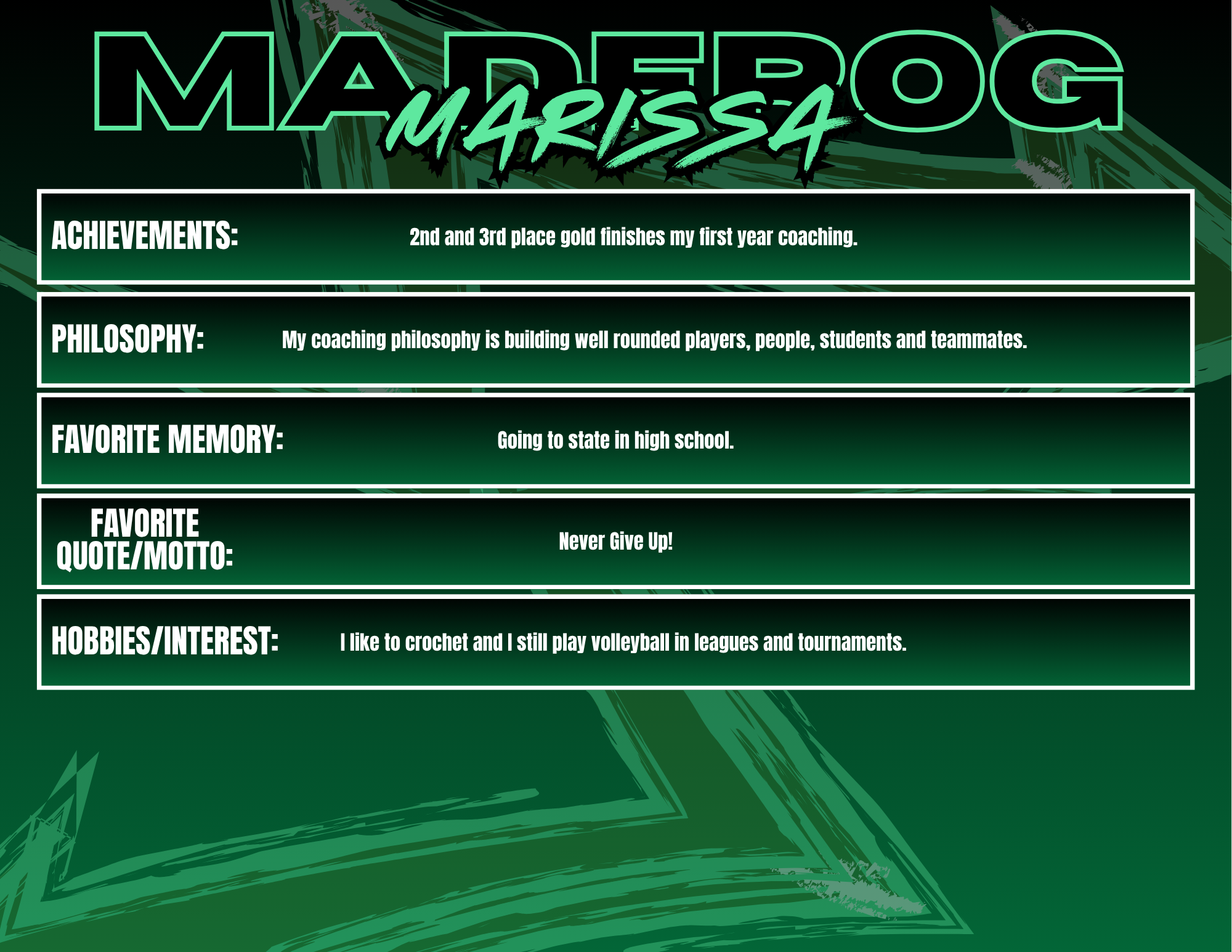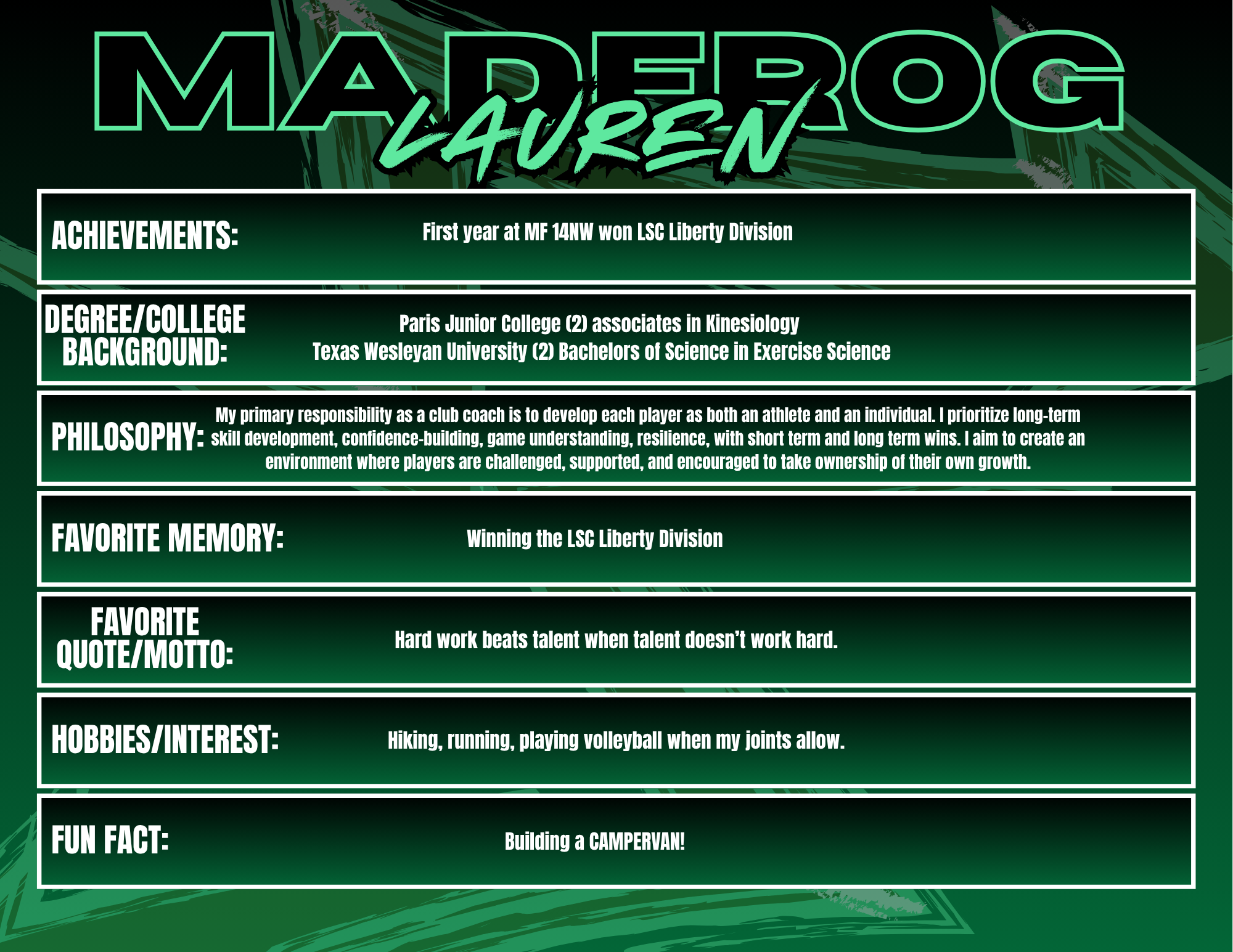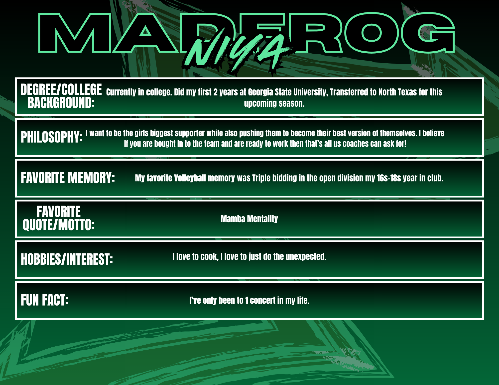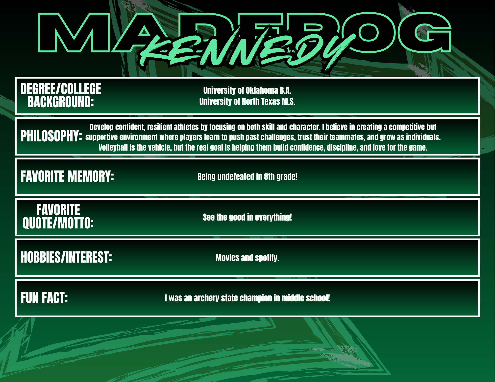 Coaching at MadFrog is such an honor because it’s also where I first learned the foundations of volleyball as a player. The club’s reputation for excellence, competitiveness, and player development shaped me into the athlete I became, and now I get to give that same experience back to the next generation. MadFrog’s culture challenges athletes to push themselves while fostering teamwork, discipline, and passion - values that continue to guide my own coaching philosophy. It’s rewarding to be part of a program that not only produces top talent but also builds well-rounded individuals on and off the court.