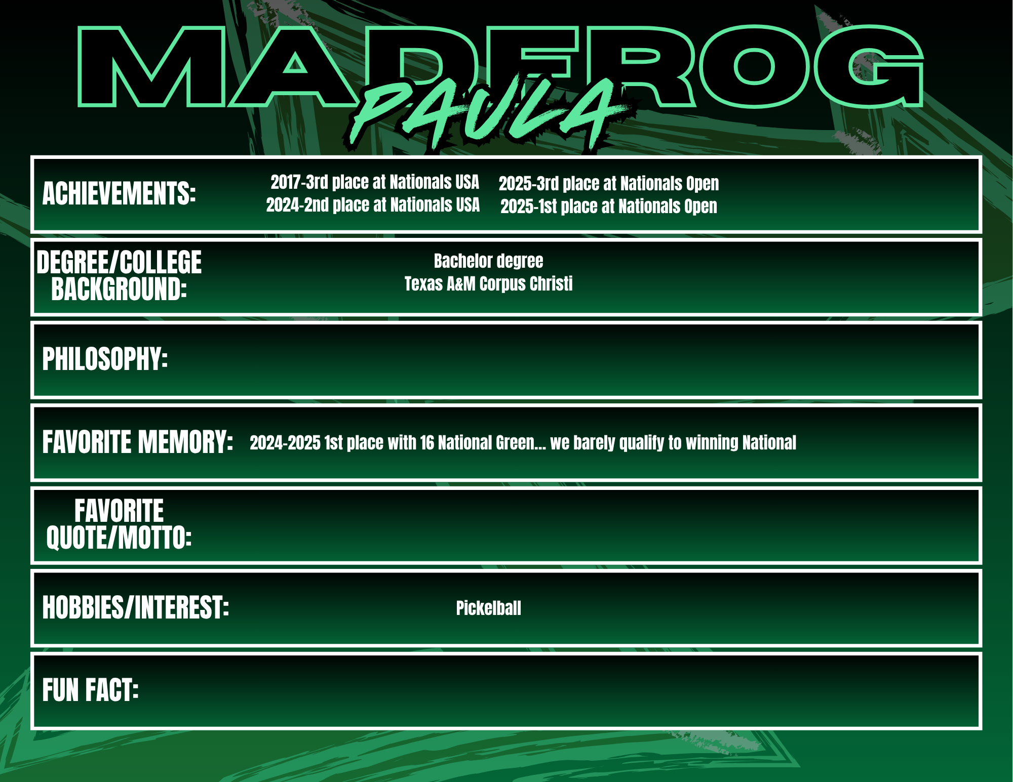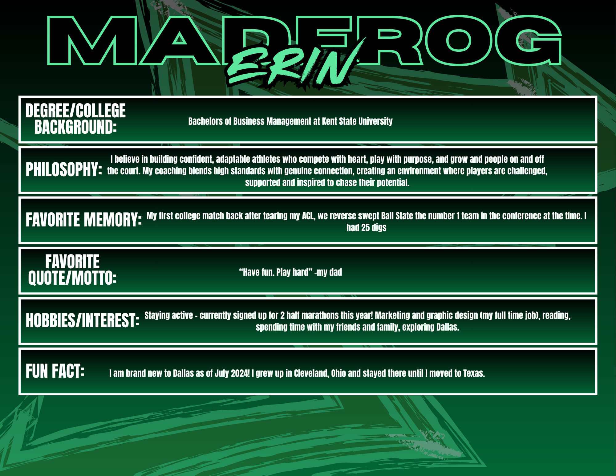 I love coaching at MadFrog because it feels like family—the culture is supportive, uplifting, and led by strong minority women who inspire both athletes and coaches. What sets MadFrog apart is the focus on building character and developing the whole athlete, not just chasing wins. It’s a place where young women grow in confidence, skill, and integrity on and off the court.