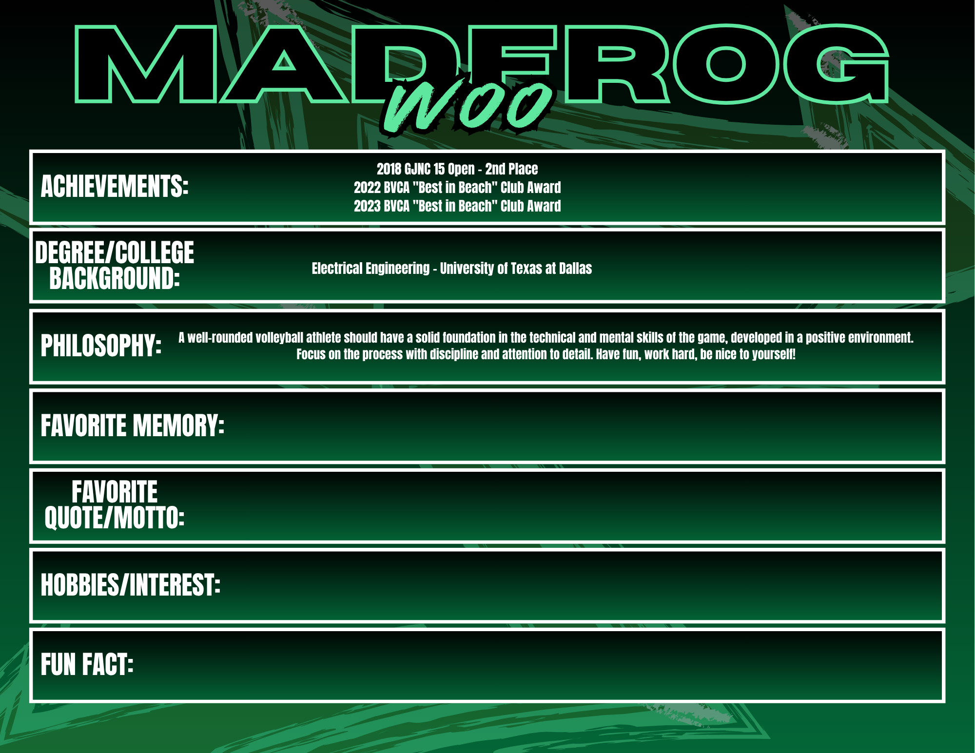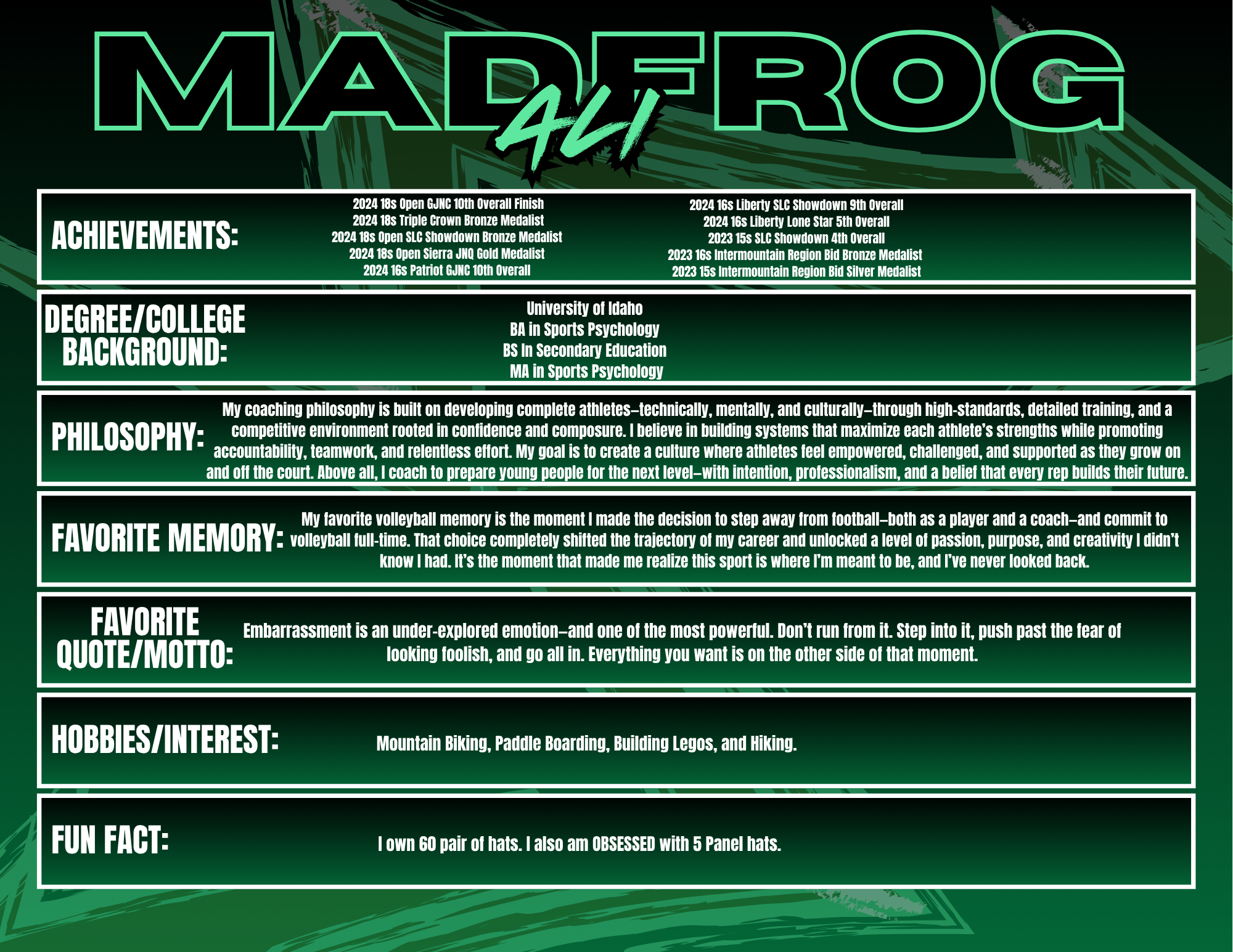 The leadership of the MadFrog is unmatched. They truly care about the athletes and their coaches. The leadership and the club have great values, and the club provides ample opportunities for coaches and athletes to improve. I love the elite level of MadFrog, but how the entire coaching staff and leadership are family and they are always their supporting each other on and off the court.