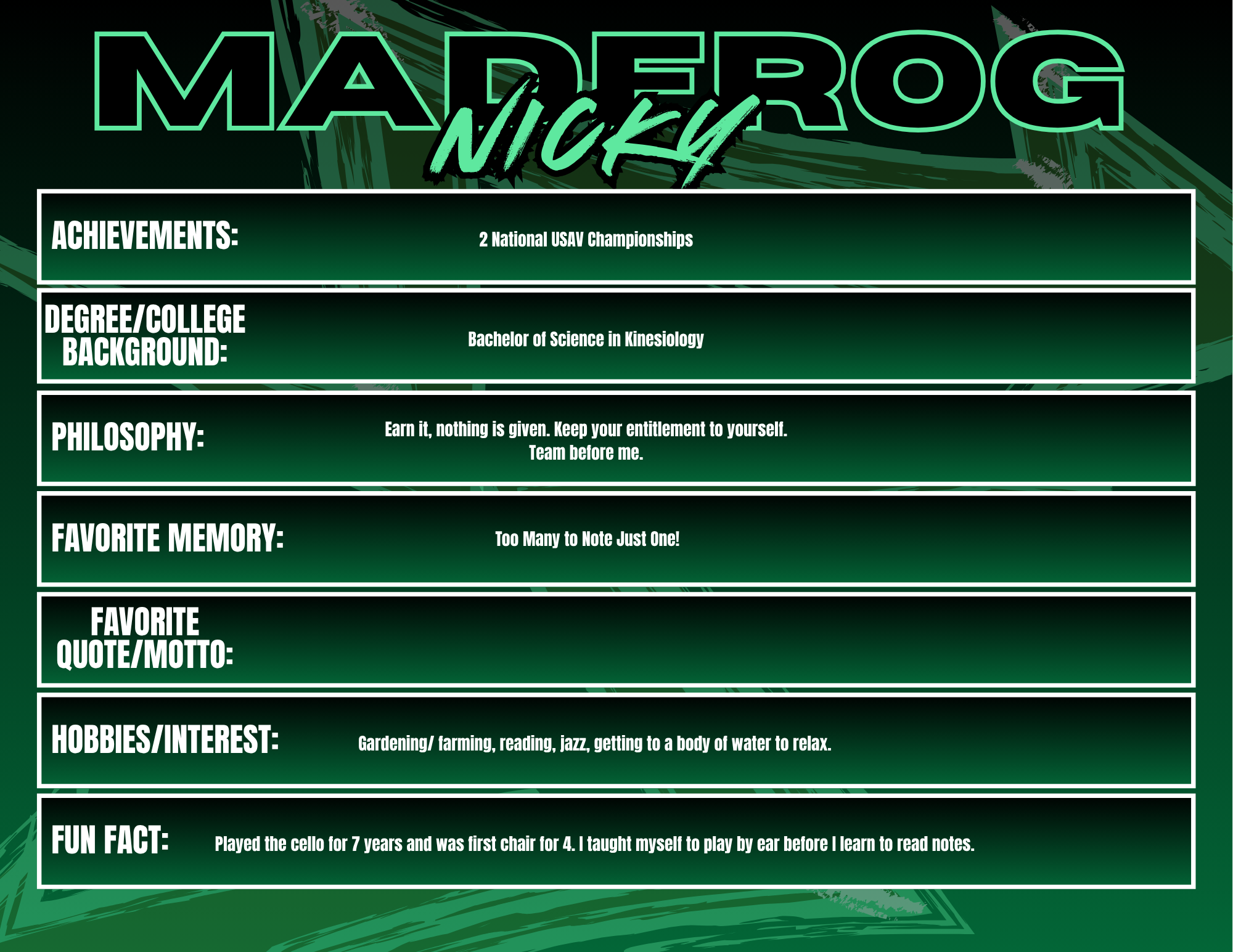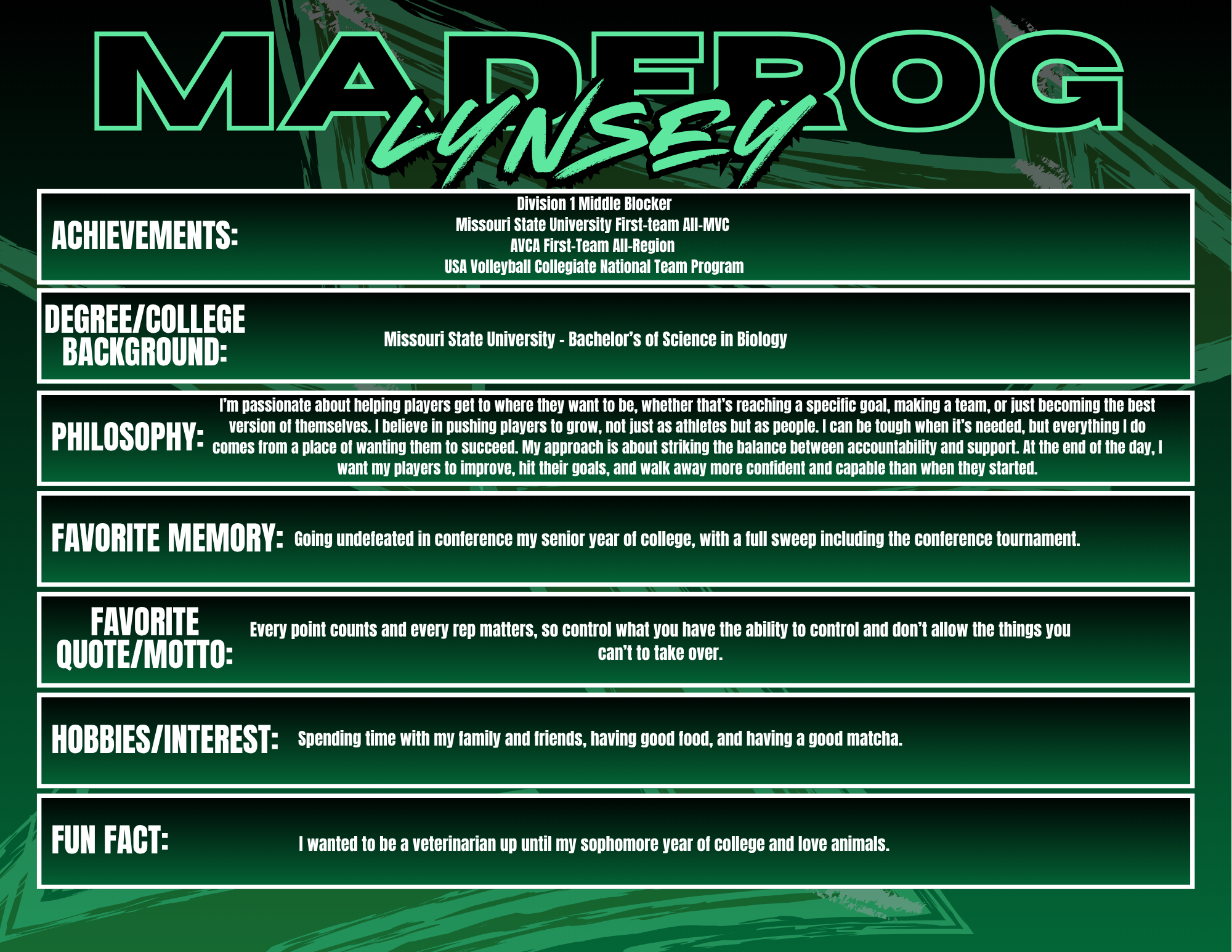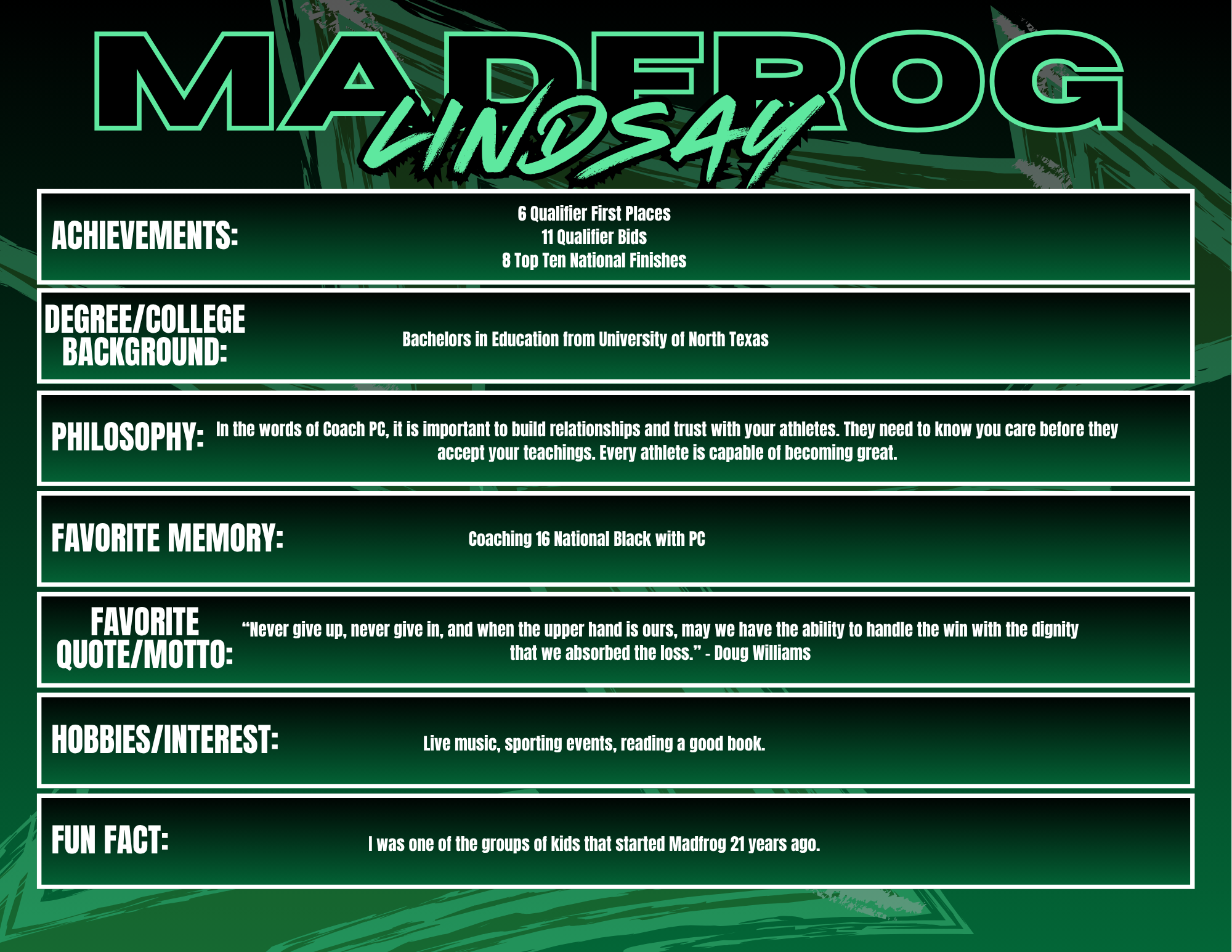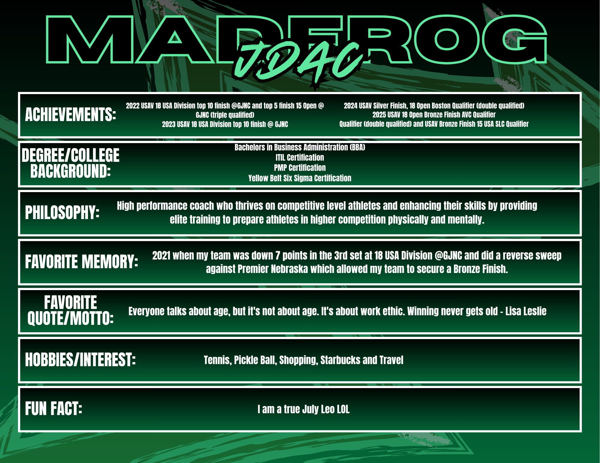I would never coach for another club in the state of Texas. MADFROG is one of the most fundamental training clubs in USAV and the diverse membership makes it appealing and a comfortable environment for everyone to participate in.